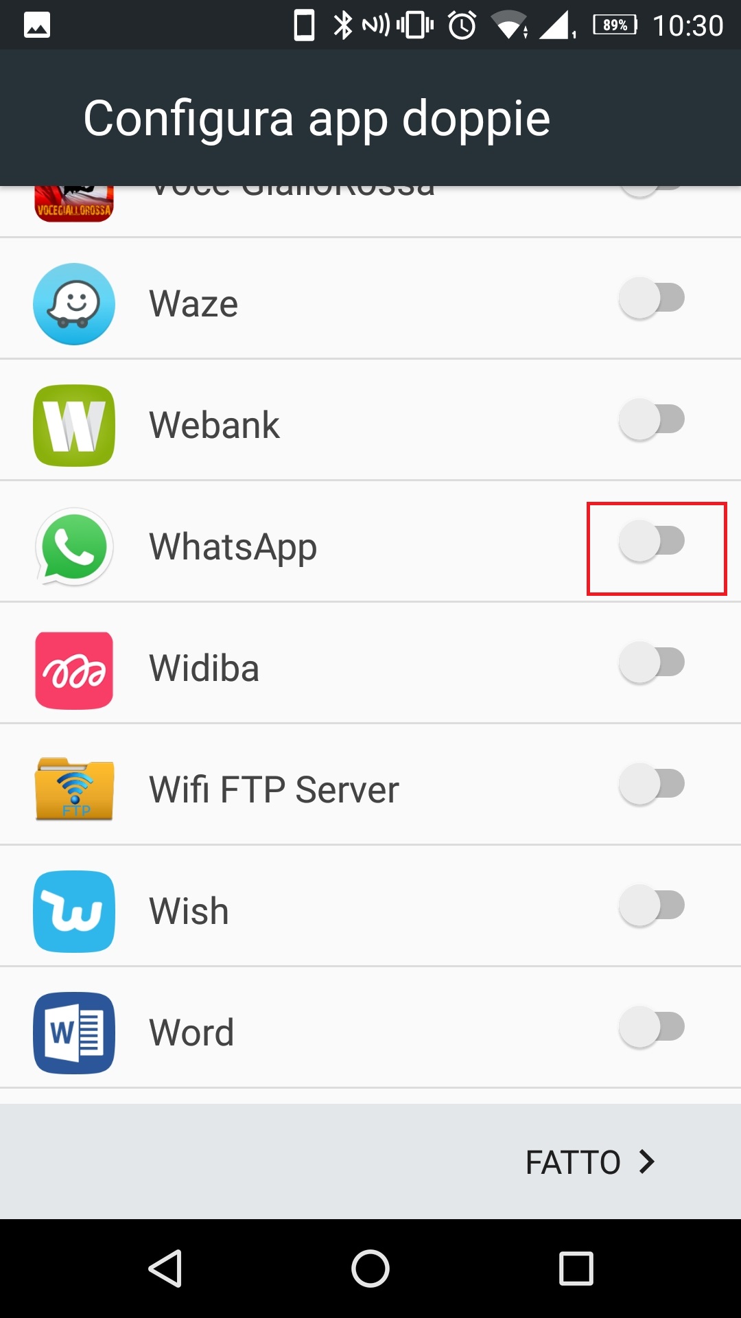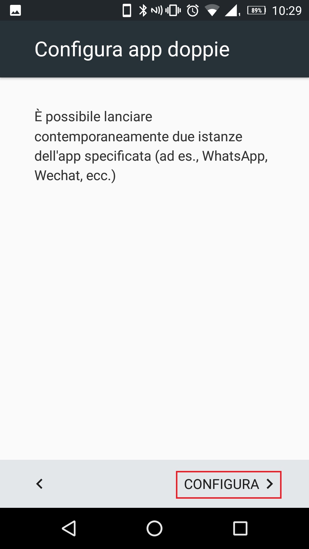 Nel menu successivo, bisogna cliccare su ” Configura “ per consentire ad Android di impostare la possibilità di avere un doppio account Whatsapp . Una volta che lo smartphone ha ultimato la configurazione, si aprirà una schermata nella quale sono presenti tutte le nostre applicazioni. A questo punto basta ” accendere “ l’ applicazione che ci interessa per avere un doppio account. Per effettuare quest’ ultimo passaggio, basta spostare il cursore che si trova vicino al nome dell’ applicazione da sinistra verso destra. A questo punto, se abbiamo fatto tutto bene, possiamo aprire un doppio account whatsapp.